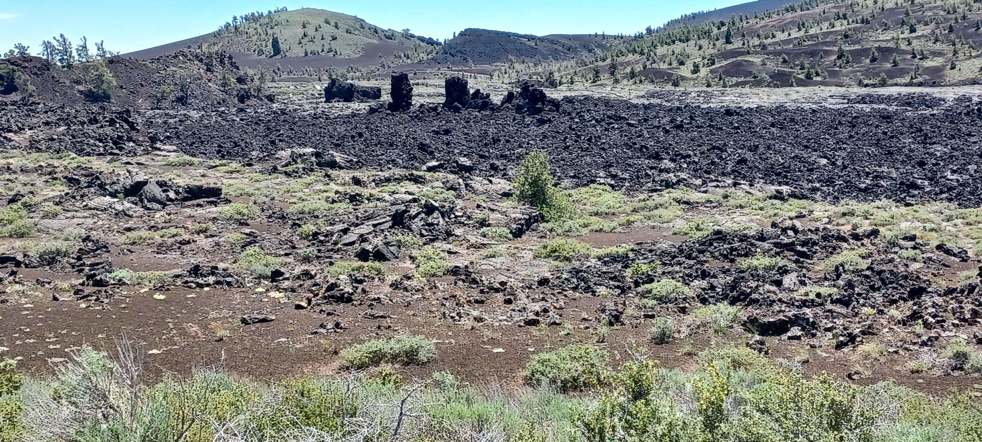 Craters of the Moon we didn’t get to visit the way we thought we could. The parking lot at the Visitors Center was full and small. They only provide about five spots for RVs and a few people dropped their trailers to drive through the park. It was very warm and busy on our landing day. Again, it was a road stop travel point. Disappointing but this is our only picture taken from the roadside. Nothing exciting. It is a park of lava rocks. And, checked off the list. Too warm, to leave the dogs in the RV to explore on our own.
