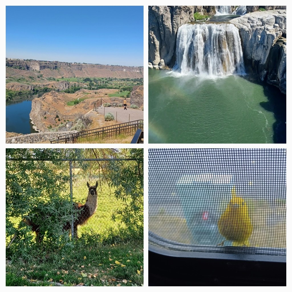 Camping next to a farm is not uncommon. We’ve enjoyed horses, cows and sheep and a few donkeys. The llama that cruised by with the cattle in Provo UT and came up to the fence for a nibble of leaves was a new one. One morning while sitting at the dinette having my morning brew, I kept seeing a shadow grazing the screen on the window. I lifted the shade and this little yellow cutie landed on our tiny ledge. I guess he or she wanted to say hello too. He/she landed there several times. The little things in RV life that make me smile.