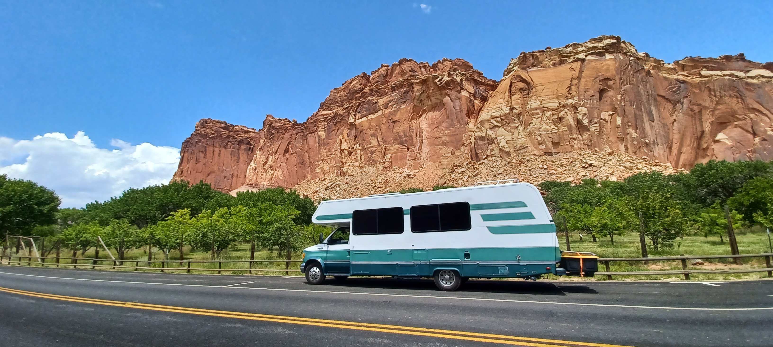 This month we checked off one. Capitol Reef. It was a day trip about 75 miles from our month-long camping spot. The weather was good, not windy and a calm beautiful drive. The scenery in Utah is stunning. It has color. Beautiful reds, orange, and greens make for a beautiful backdrop. The 19-mile scenic drive unfortunately was closed for construction we were only able to see up to the Gifford House and no we didn’t try the pie. Sorry. Nonetheless, it was a good day and we enjoyed our journey out.