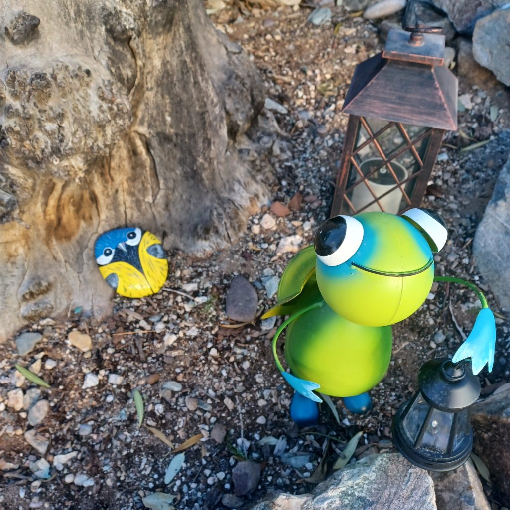 My neighbor Sibyl is an artist, and she gave us all painted Seahawks rocks. (Pictured below) Isn’t it adorable? I love it. The turtle is a gift from my friend Pat. The lantern is mine. A dollar store find from many years ago. I love solar lights.